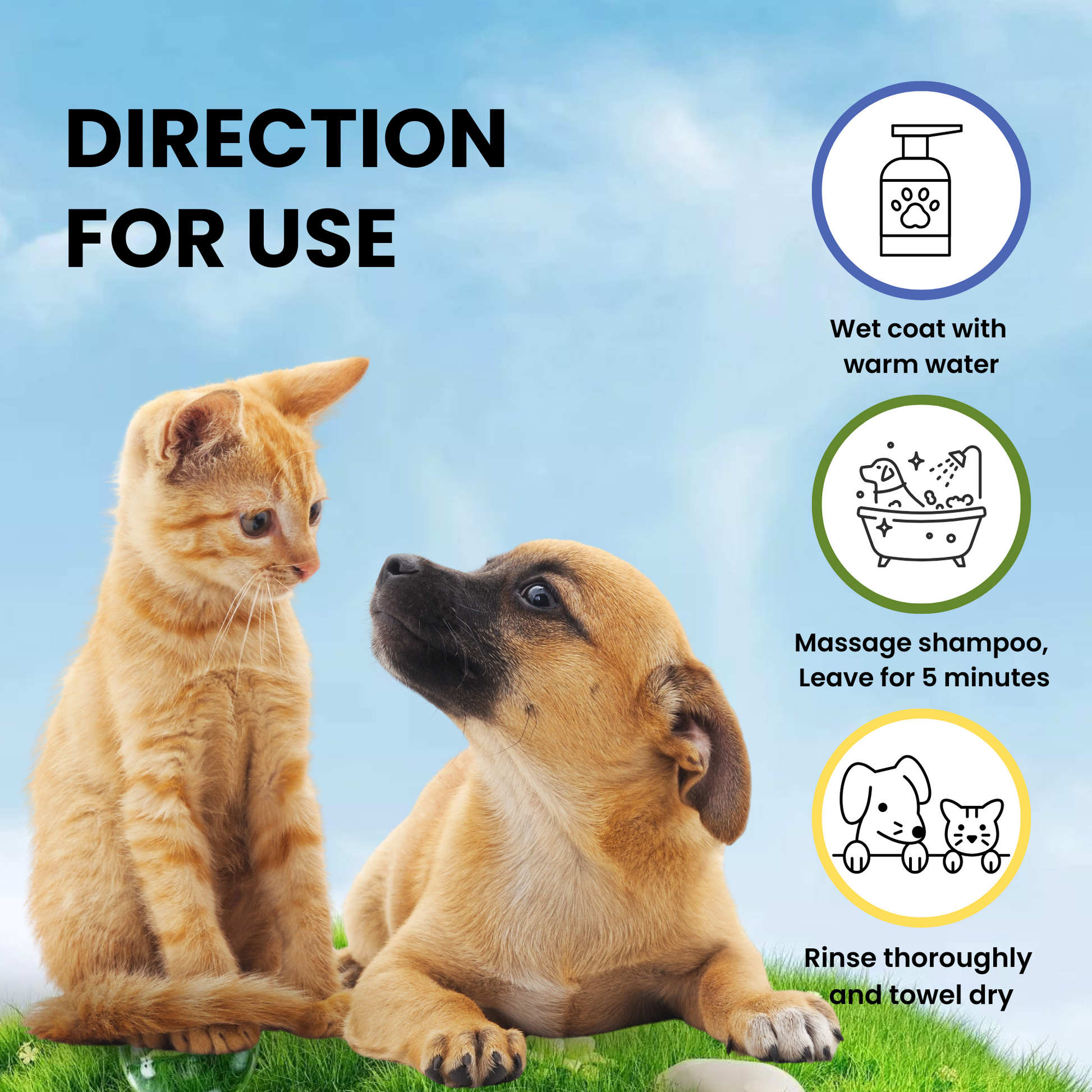 Wet your pet’s coat thoroughly with warm water. Apply shampoo from the back of the ears to the tail, avoiding the eyes. Gently lather and massage into the coat and skin. Rinse completely and towel dry for a fresh, clean coat.